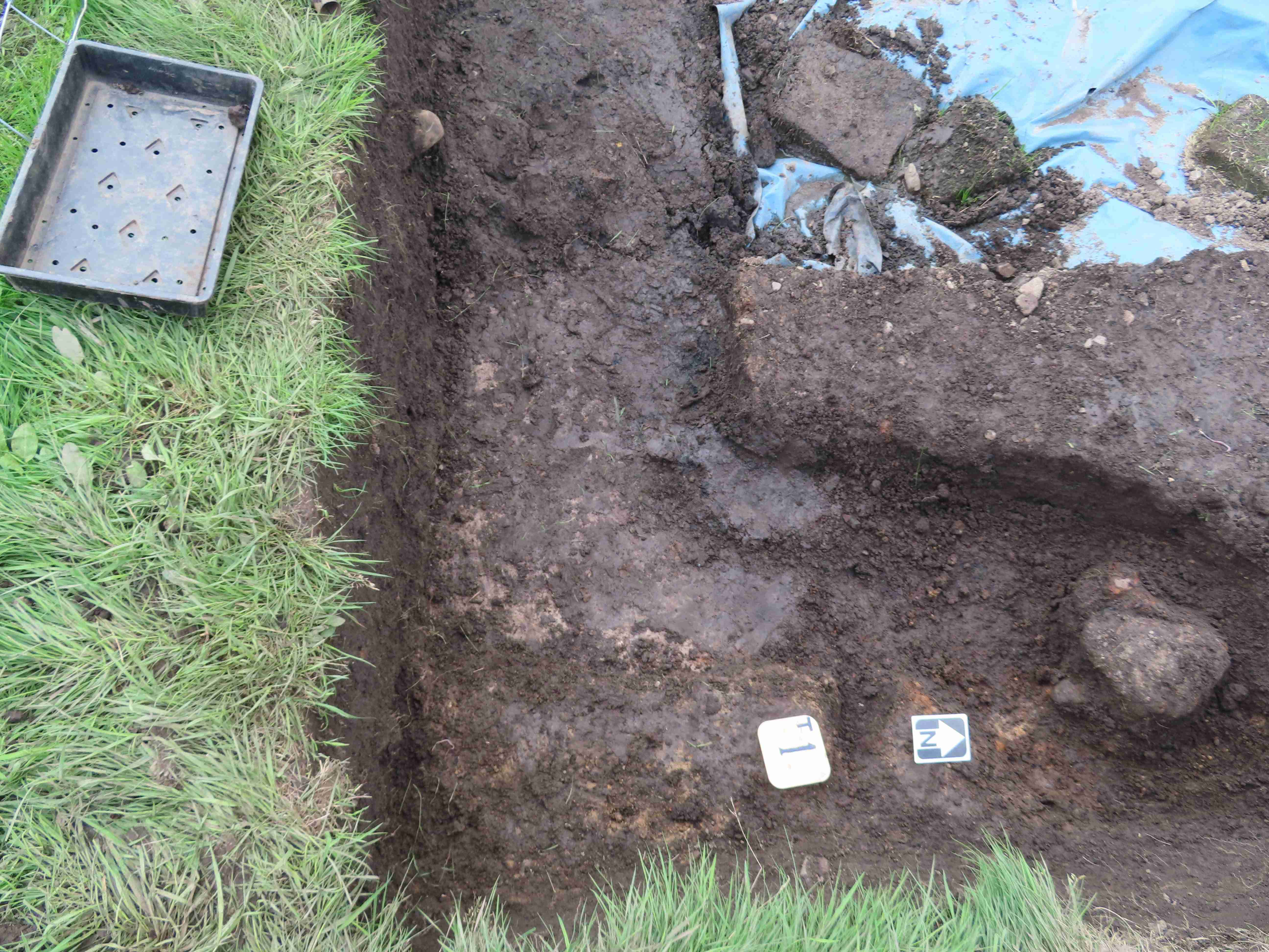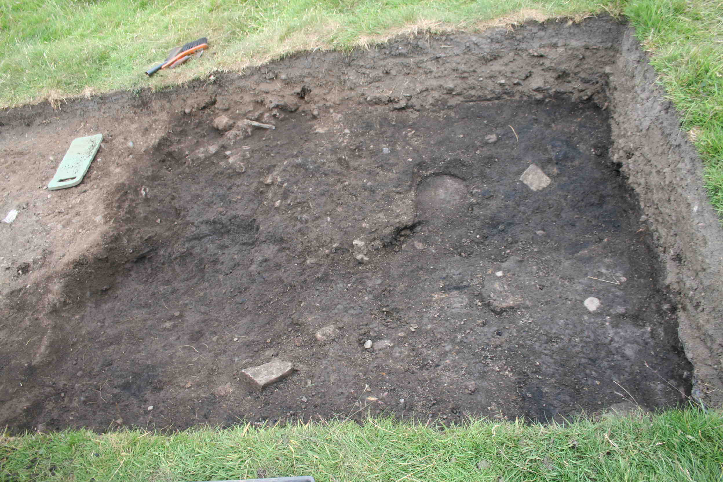 A section of top soil on the northern end of the trench was removed to confirm natural ground had been reached and no further archaeology would exist any further down. As the underlying surface was confirmed as being natural, no further work will be carried out in this section of the trench. Photo 7.