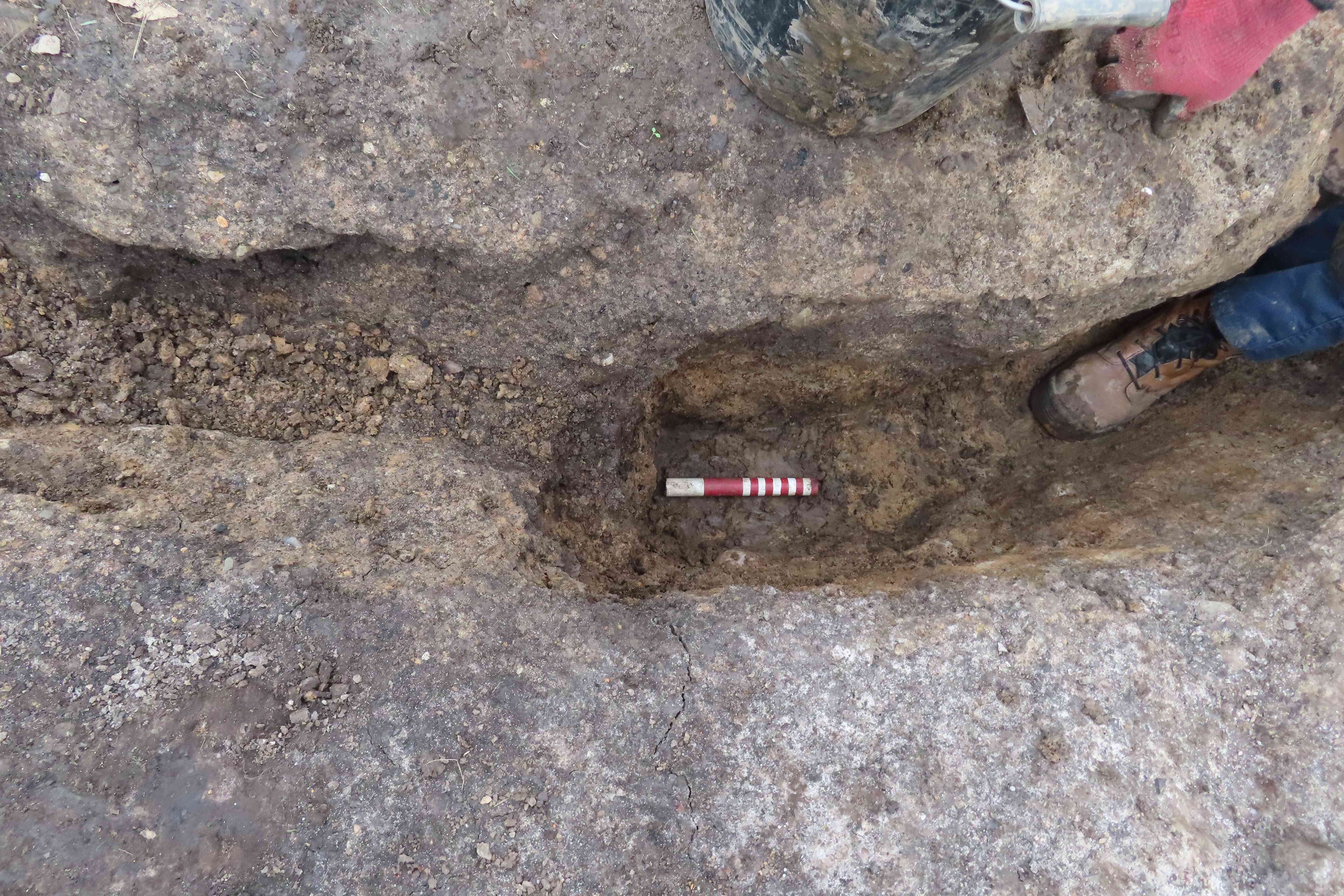Work was also carried out clearing the area just to the north of the pieces of rounded slag to identify a cut coming through the trench in a westerly direction, going through to 2019’s trench 5. Photo 2