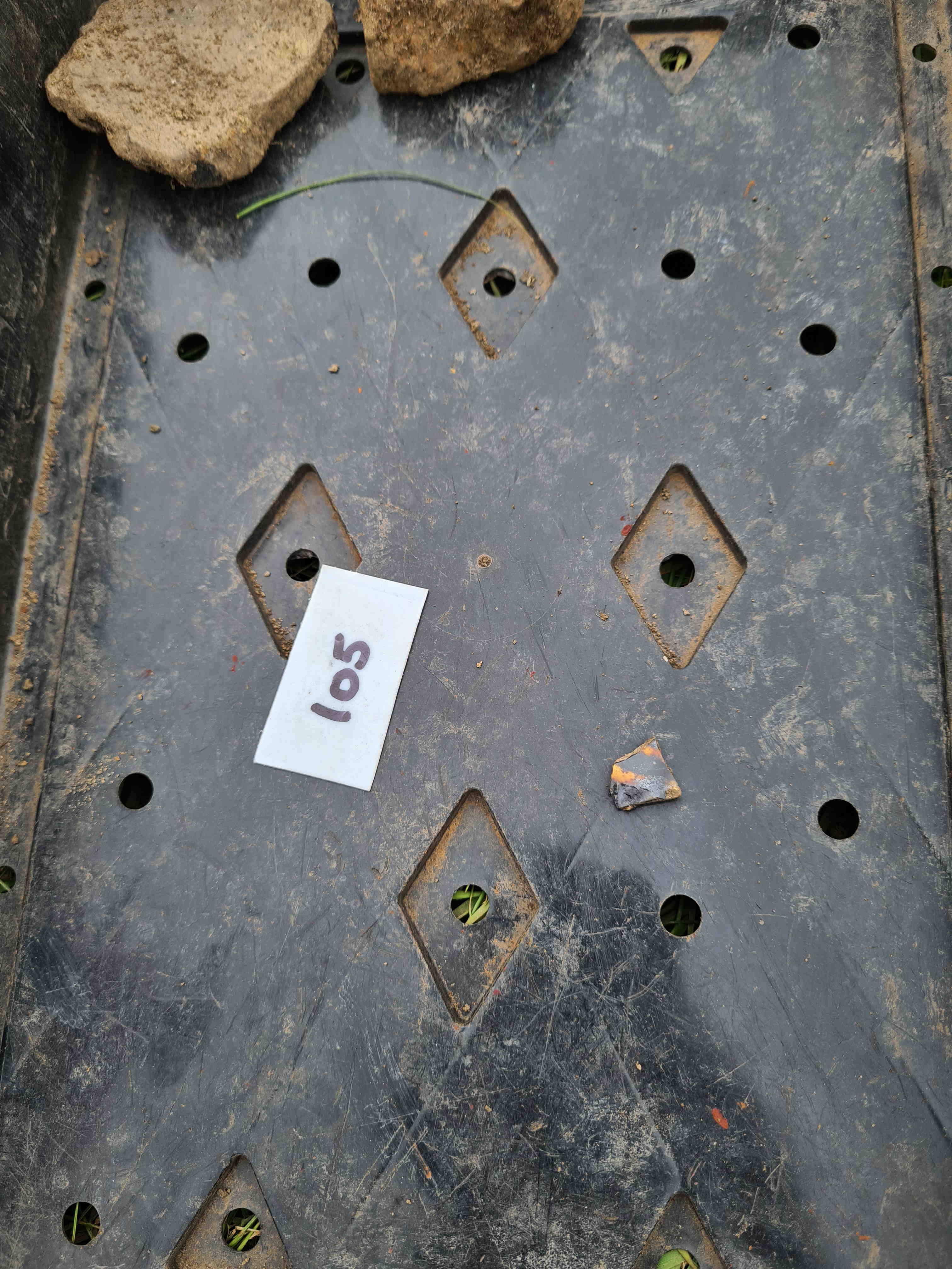 Despite the soil being baked hard by the sun, steady progress was made removing the topsoil from the trench. Disappointingly very few finds have been recovered from the trench since it was opened. Over the weekend a small number of post mediæval pottery sherds and a piece of a jug handle were recovered. Photo 4. Red rust patches, normally caused by rusting hammer scale has been uncovered in the trench. Photo 5